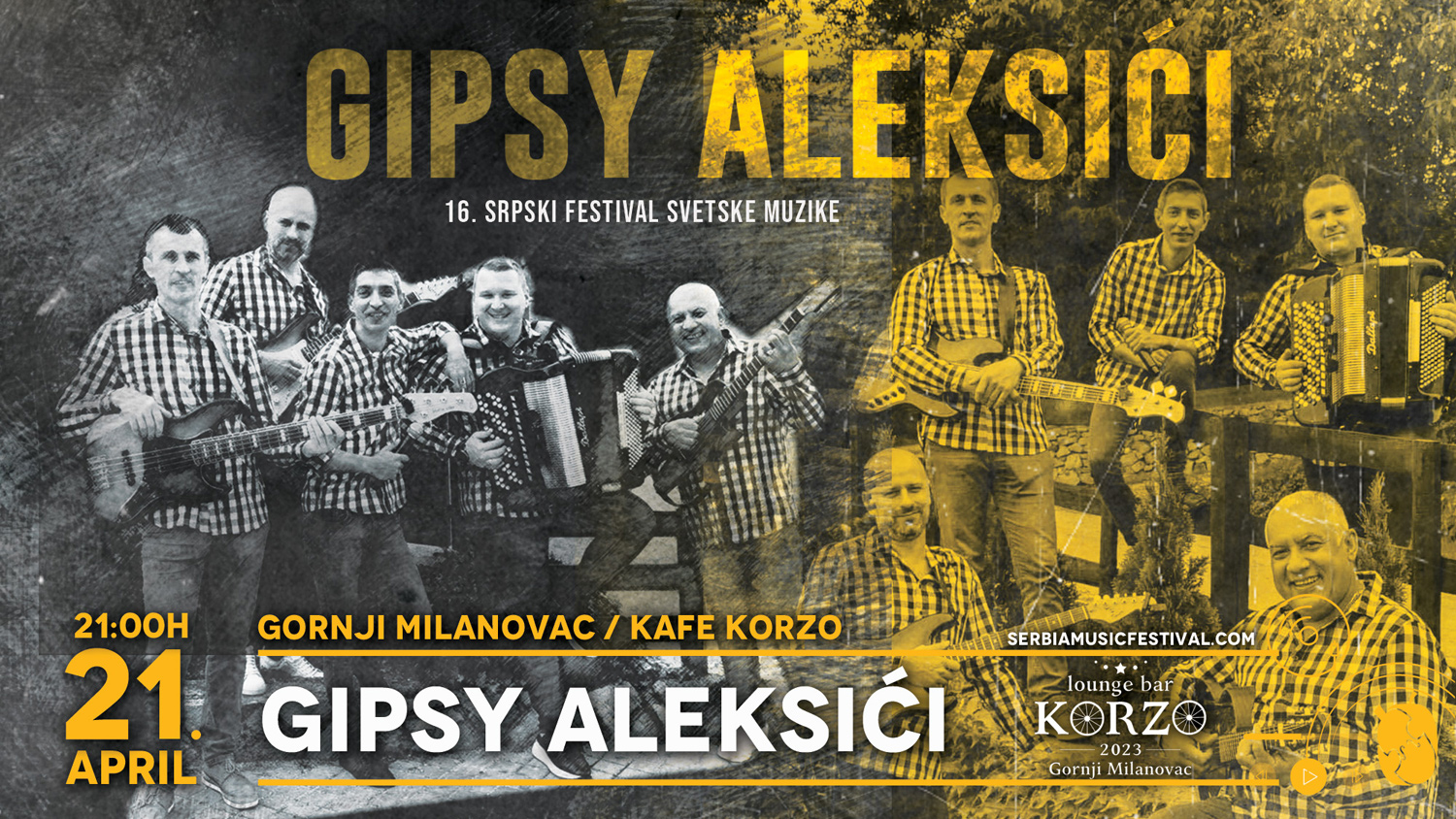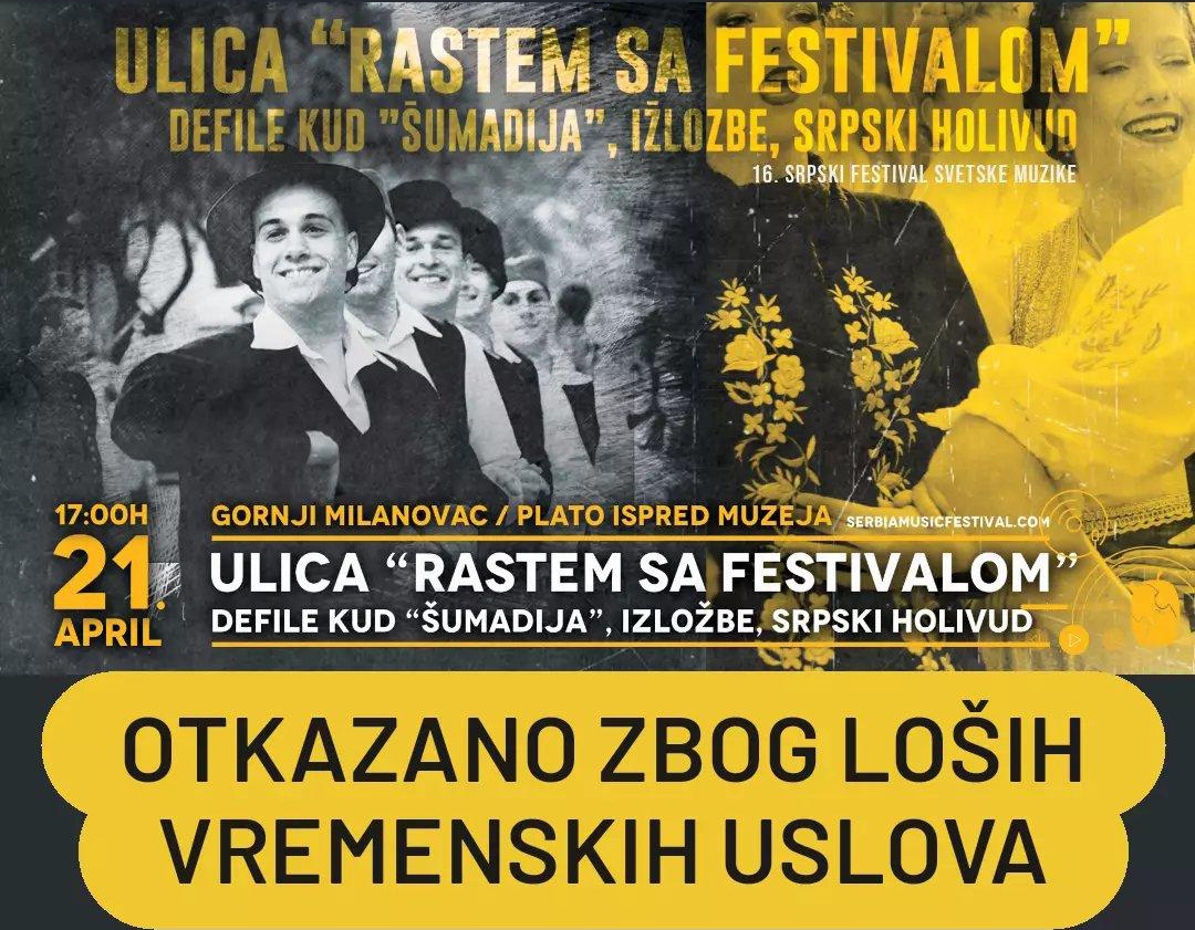 Vesti / Treći dan festivalaZbog loših vremenskih uslova i najavljene kiše, otkazuju se festivalske manifestacije koje su planirane za nedelju 21. april, na otvorenom. Manifestacija "Sportski dan" i ulica "Rastem sa festivalom" nažalost neće biti održane. Trećeg dana festivala na programu je klupska svirka grupe Gipsy Aleksići u kafeu Korzo, sa početkom od 21 čas. Dobrodošli u grad festival! |