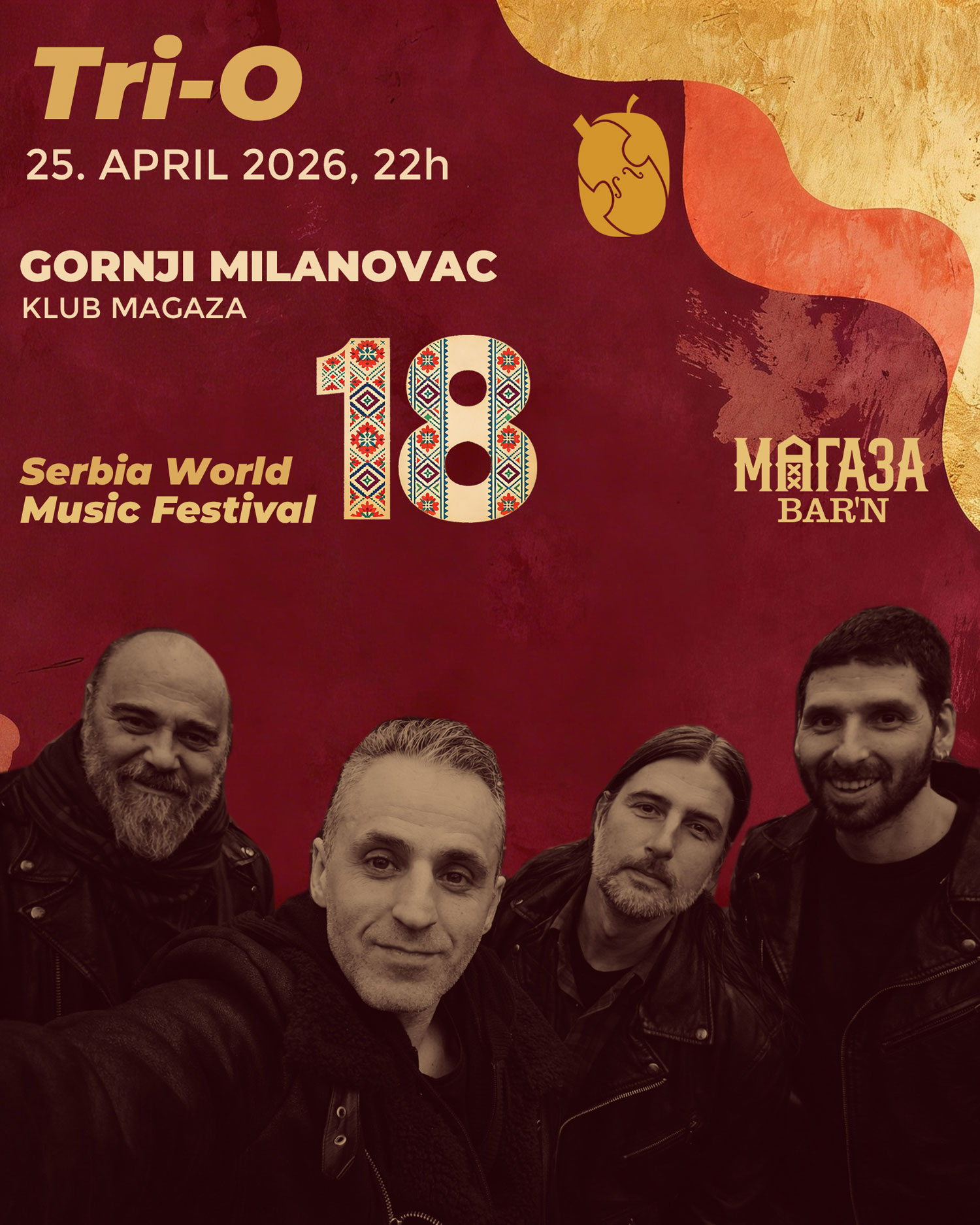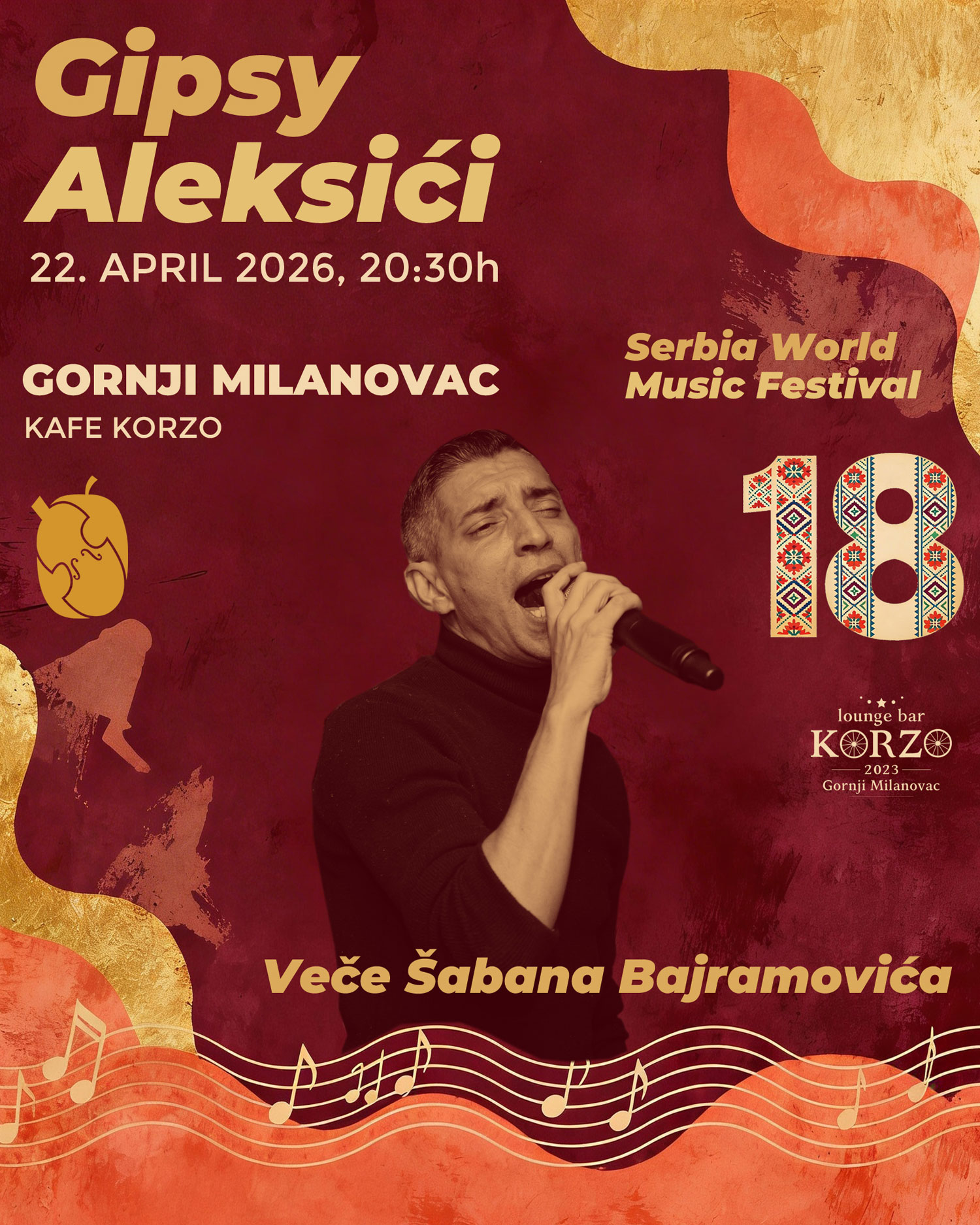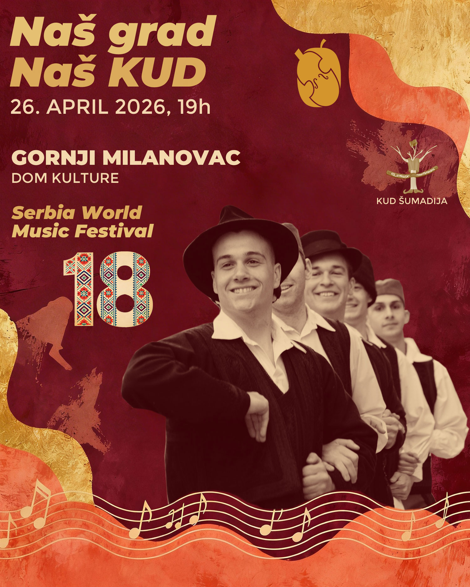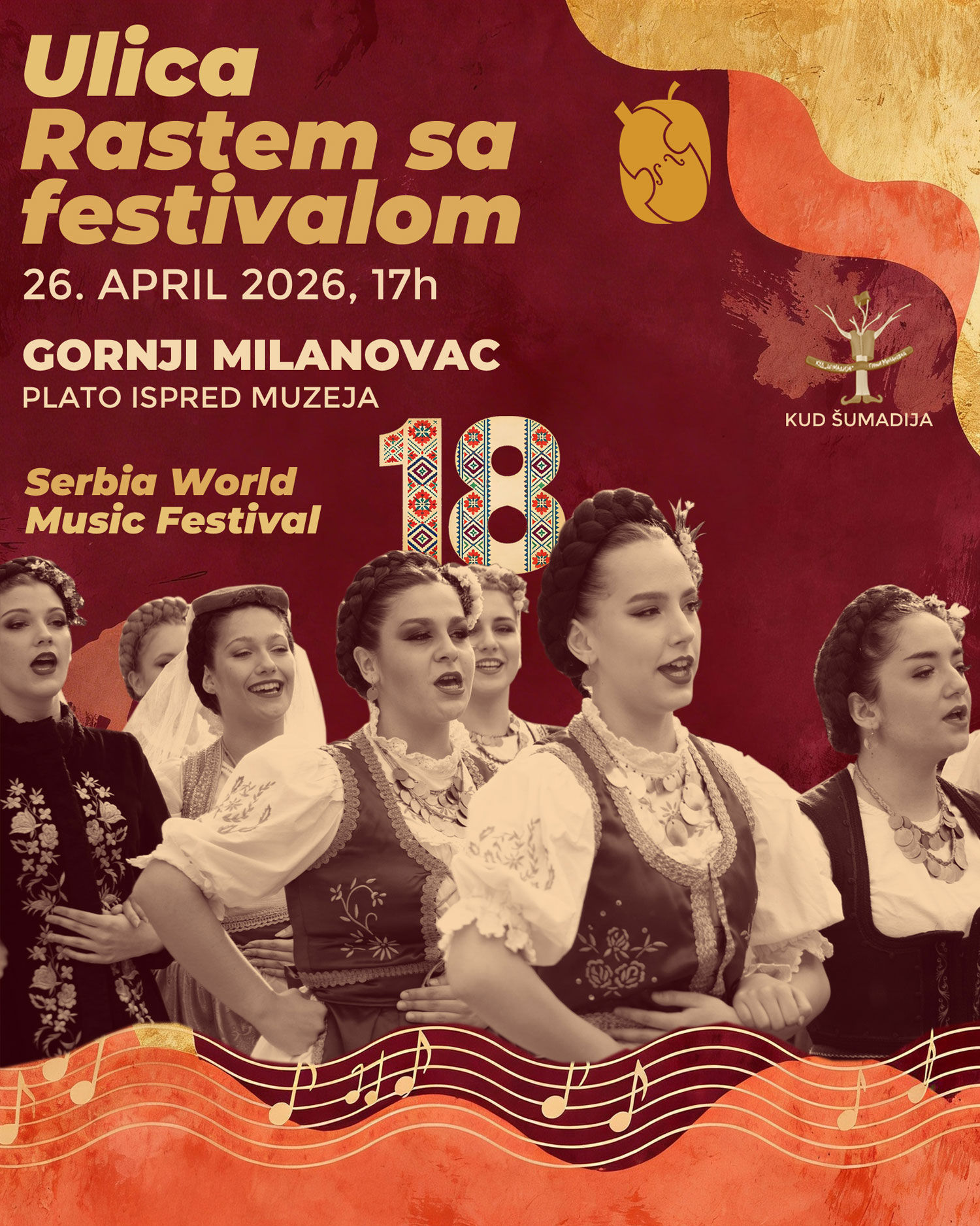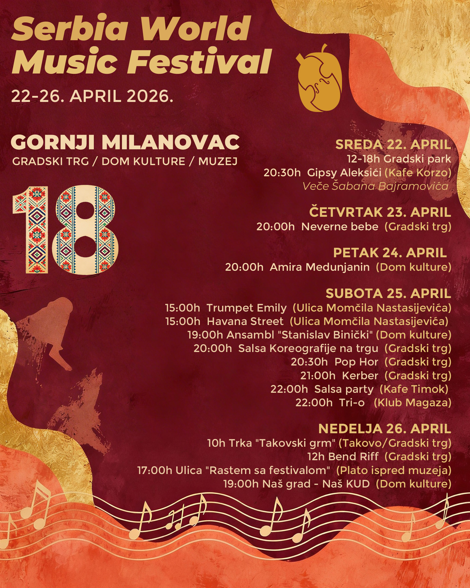 Festival svetske muzike u Srbiji ima za cilj, da pored niza koncerata Etno muzike na visokom umetničkom nivou, ujedini muzičare i ljude iz različitih zemalja bez obzira na kulturnu i religioznu pozadinu. U predstvaljanju bendova iz više zemalja, publika ima priliku da uživa u mešavini različitih vidova muzike, pre svega romske, kao i u zvucima nezaobilazne balkanske muzike, ali u ovom slučaju u potpuno novom svetlu. Program je upotpunjen i koncertima specijalnih gostiju festivala. Opština Gornji Milanovac je idealno mesto za održavanje ovog festival,a kako zbog istorije i kulture podneblja, tako i sa aspekta seoskog turizma koji želimo da predstavimo gostima i svetu. |